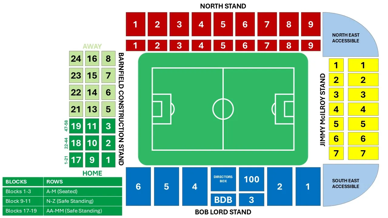 Southeast Stand: Found in the corner between the Jimmy McIlroy and Bob Lord Stands, this section also has three levels and is designed for both ambulant and wheelchair supporters.