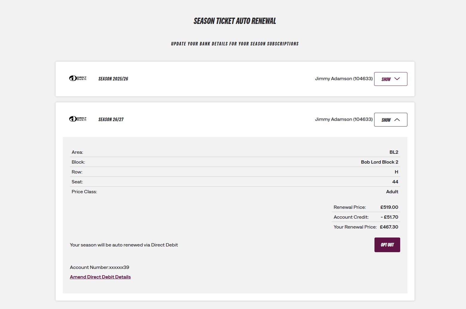 Season Ticket holders that currently pay by Direct Debit will renew on Tuesday 14th April, when a booking confirmation will be sent via email.